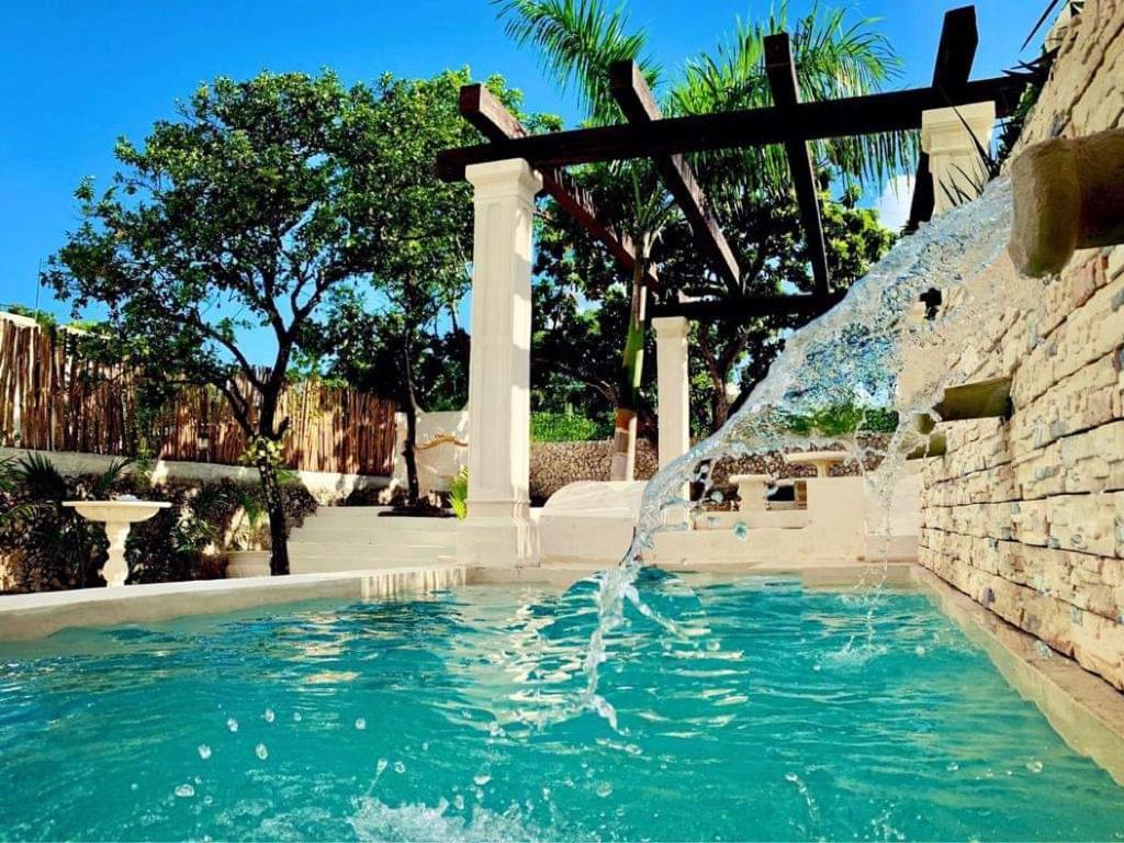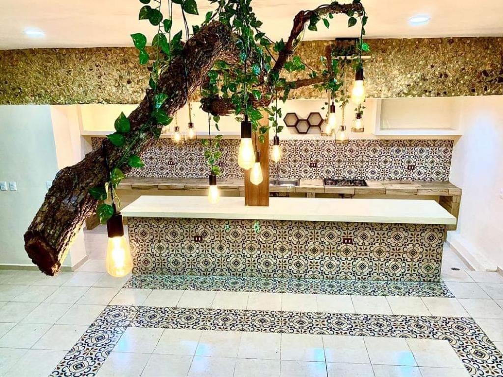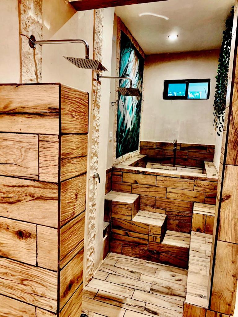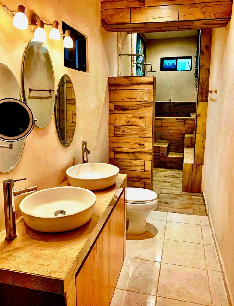 Large dining room (6×6.5m) and kitchen (6.5×2.5m) with panoramic views of the gardens, double height with indirect lighting, ideal for living or for an Airbnb business, fruit trees (mamey, huaya, avocado, orange trees), garden interior, swimming pool (7×3.5) and sunbathing areas with Chukum finishes, two complete bathrooms with showers, the main bathroom 7.5m long with double sinks, double showers and a tub for two people.