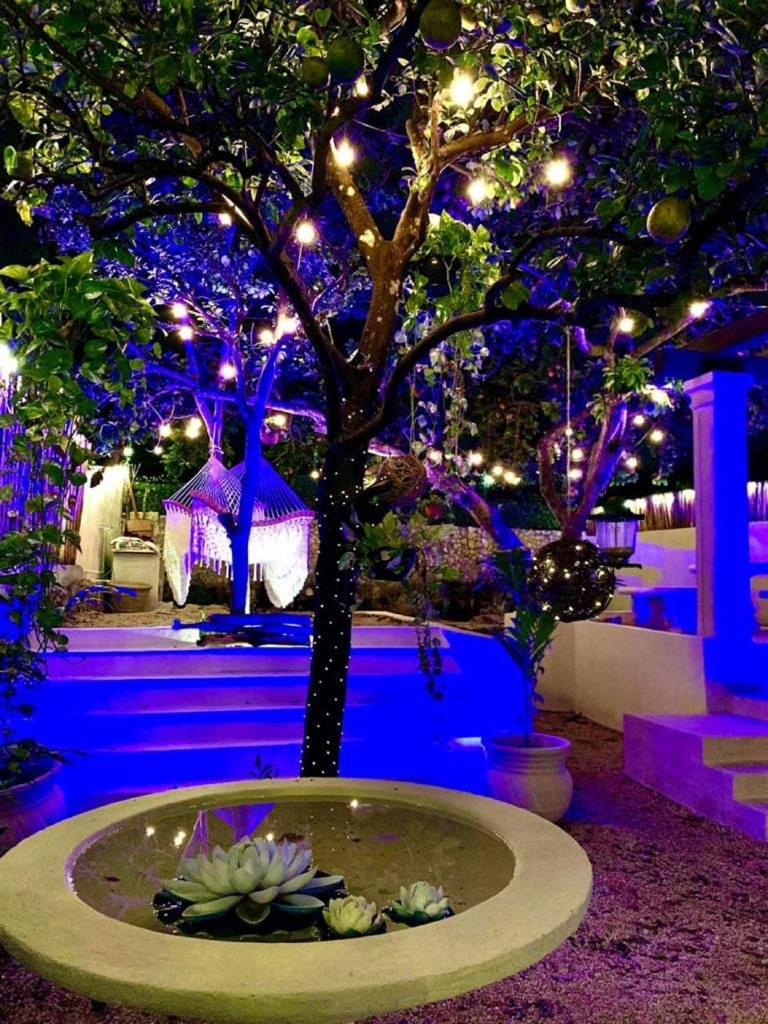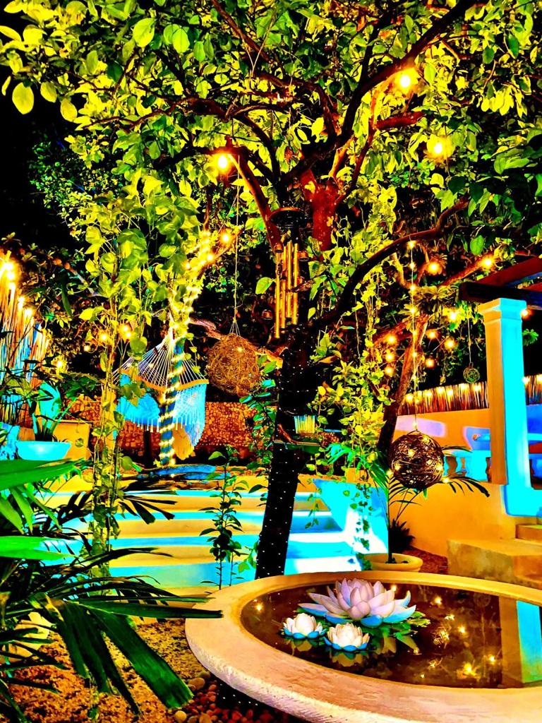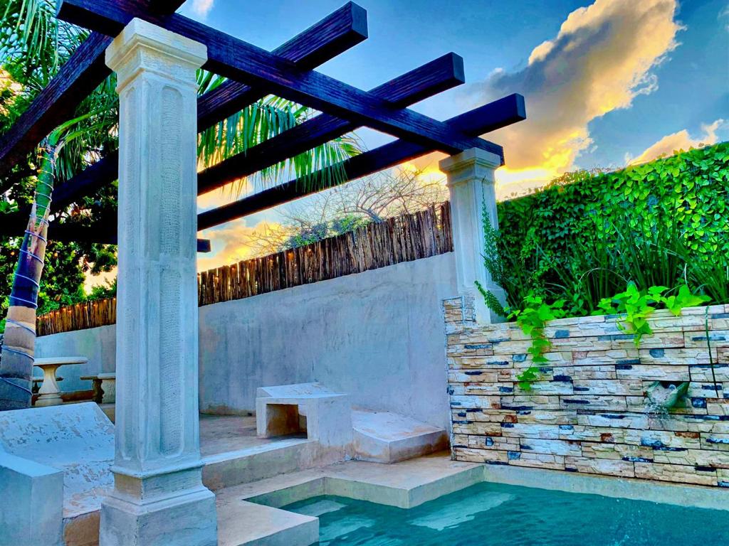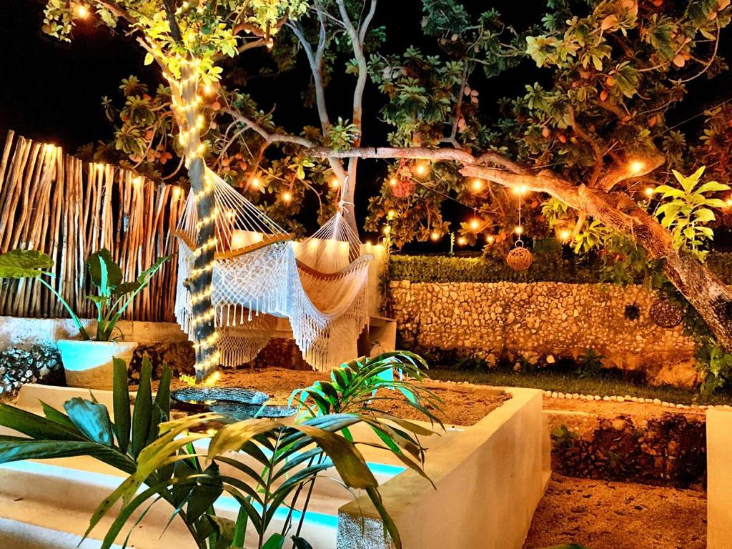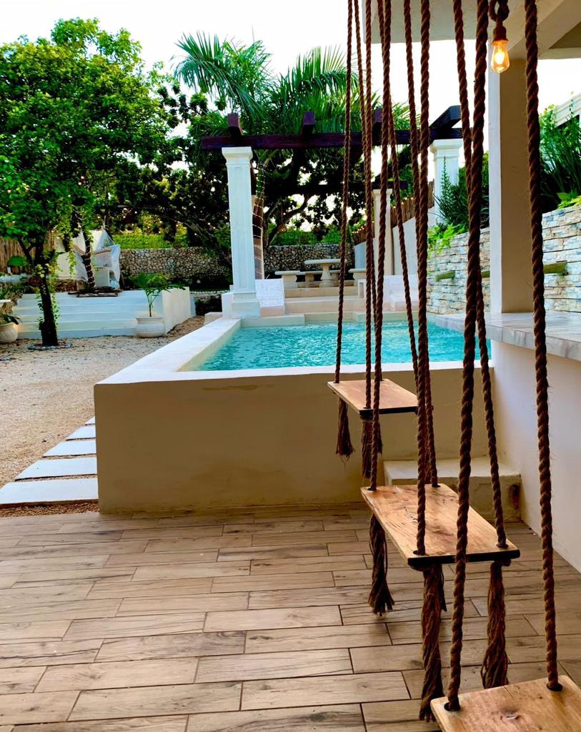 Large dining room (6×6.5m) and kitchen (6.5×2.5m) with panoramic views of the gardens, double height with indirect lighting, ideal for living or for an Airbnb business, fruit trees (mamey, huaya, avocado, orange trees), garden interior, swimming pool (7×3.5) and sunbathing areas with Chukum finishes, two complete bathrooms with showers, the main bathroom 7.5m long with double sinks, double showers and a tub for two people.